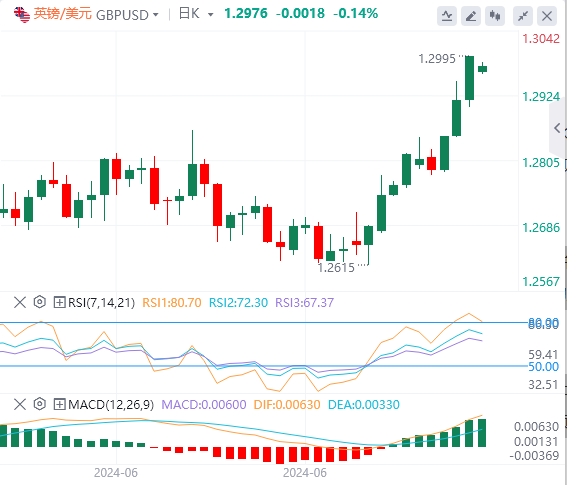 异同移动平均线(MACD)指标反映出短期看涨势头,MACD指标位于中线上方,与信号线呈正背离。不过,14天相对强弱指标处在70水平紧上方,确认了看涨趋势,同时也暗示可能出现超买情况。技术信号可能表明看涨情绪减弱,可能暗示即将出现整理。就阻力位而言,英镑/美元可能会测试1.3000的心理关口。若英镑/美元突破该水平可为测试关键水平1.3100附近的区域提供支撑。