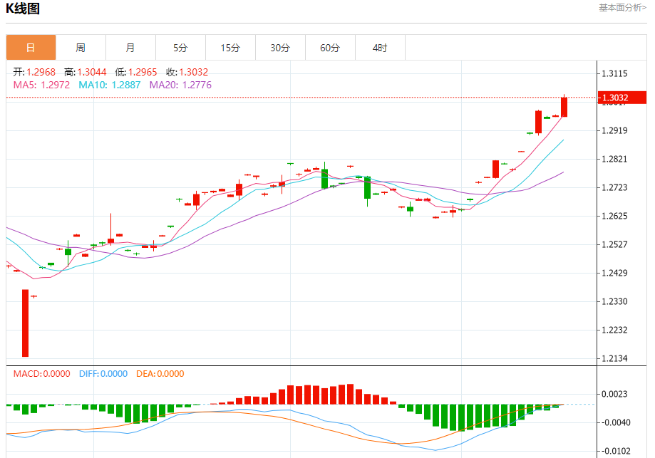 汇价高见1.3044,低见1.2963。上一交易日,汇价收于1.2972。