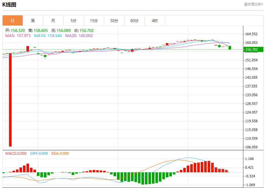 汇价高见158.614,低见156.096。上一交易日,汇价收于158.303。