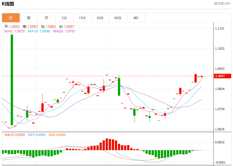 汇价高见1.0903,低见1.0883。上一交易日,汇价收于1.0893。