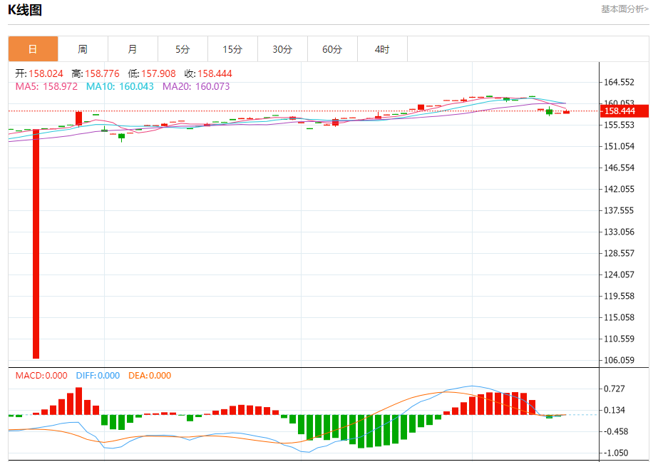 汇价高见158.787,低见157.977。上一交易日,汇价收于158.009。