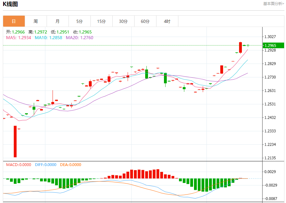 汇价高见1.2972,低见1.2951。上一交易日,汇价收于1.2966。