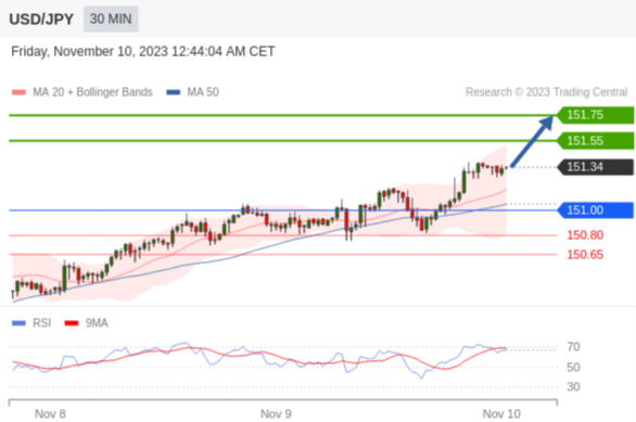 在 151.00 之上,看涨,目标价位为 151.55 ,然后为 151.75 。