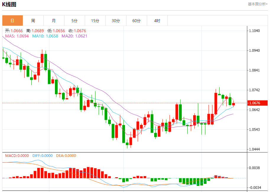 汇价高见1.0689,低见1.0656。上一交易日,汇价收于1.0668。