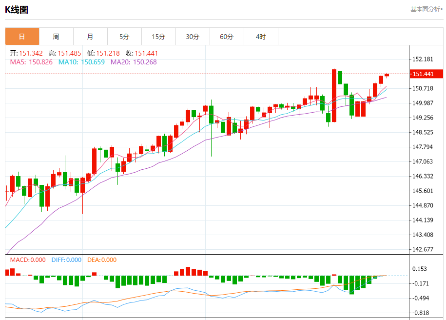 汇价高见151.485,低见151.218。上一交易日,汇价收于151.341。