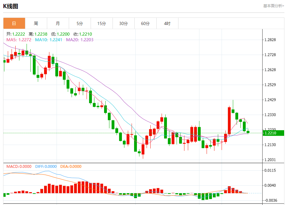 汇价高见1.2237,低见1.2200。上一交易日,汇价收于1.2222。