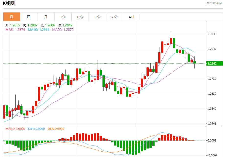 汇价高见1.2888,低见1.2806。上一交易日,汇价收于1.2866。