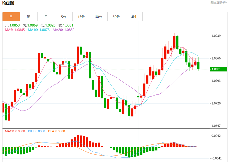 汇价高见1.0869,低见1.0826。上一交易日,汇价收于1.0855。