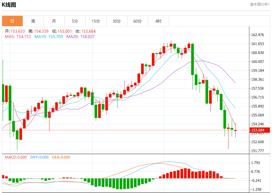 汇价高见154.349,低见153.010。上一交易日,汇价收于153.756。