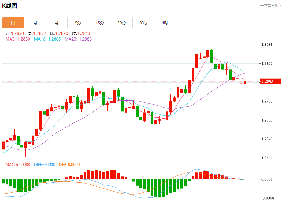 汇价高见1.2852,低见1.2820。上一交易日,汇价收于1.2834。