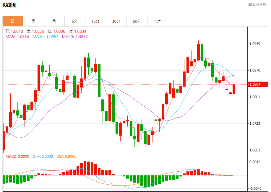 汇价高见1.0835,低见1.0806。上一交易日,汇价收于1.0814。