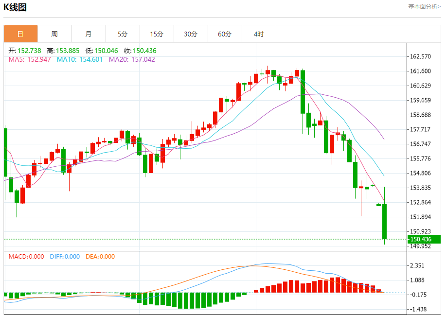 汇价高见153.885,低见150.046。上一交易日,汇价收于152.753。