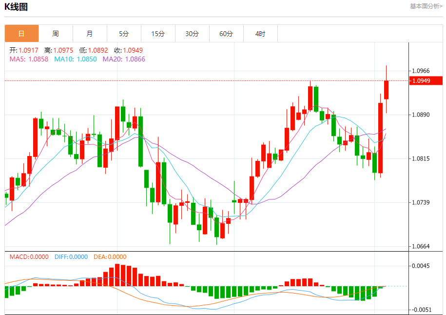 汇价高见1.0975,低见1.0892。上一交易日,汇价收于1.0910。