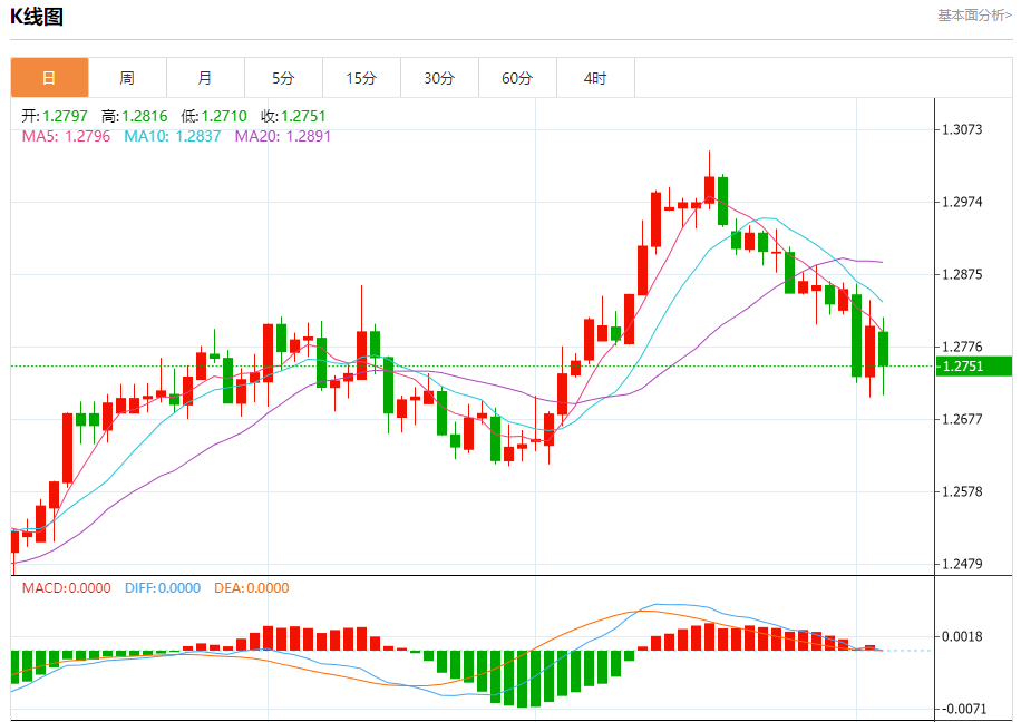 汇价高见1.2816,低见1.2710。上一交易日,汇价收于1.2805。