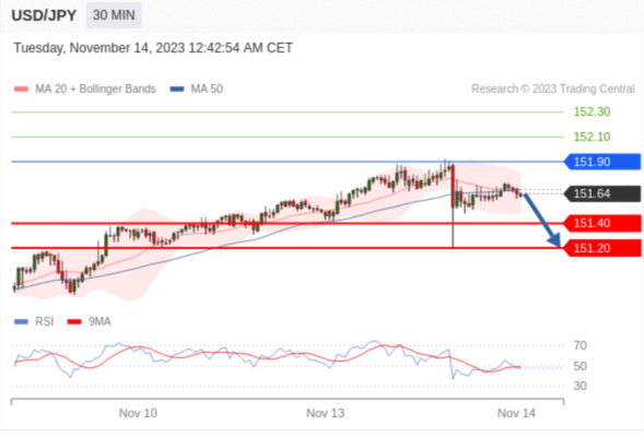 在 151.90 之下,看跌,目标价位为 151.40 ,然后为 151.20 。
