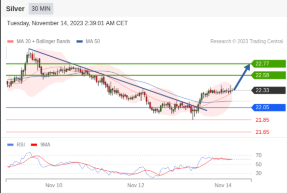 在 22.05 之上,看涨,目标价位为 22.58 ,然后为 22.77 。