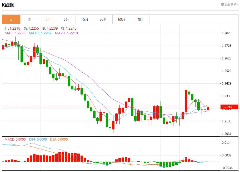 汇价高见1.2255,低见1.2209。上一交易日,汇价收于1.2223。