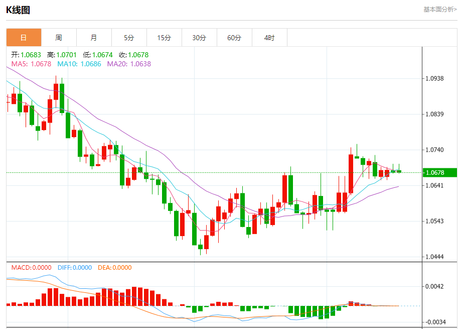 汇价高见1.0701,低见1.0674。上一交易日,汇价收于1.0683。