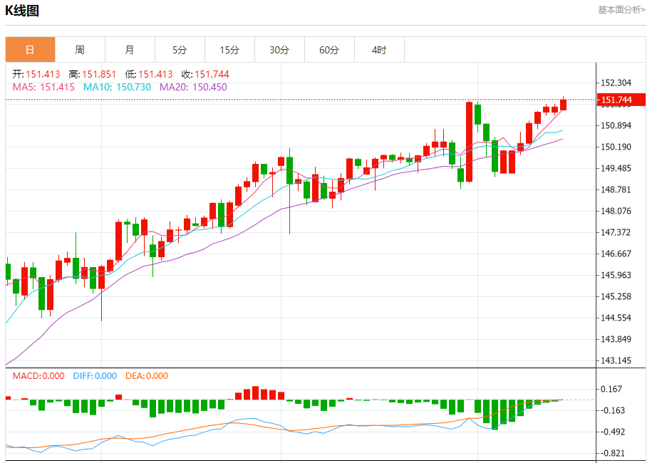 汇价高见151.851,低见151.413。上一交易日,汇价收于151.510。