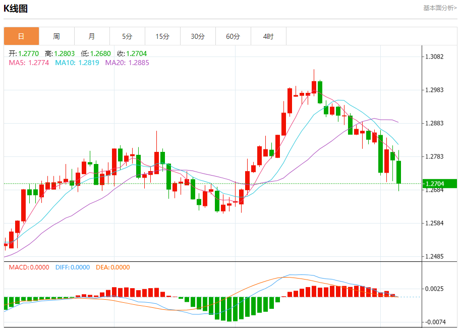 汇价高见1.2803,低见1.2680。上一交易日,汇价收于1.2773。