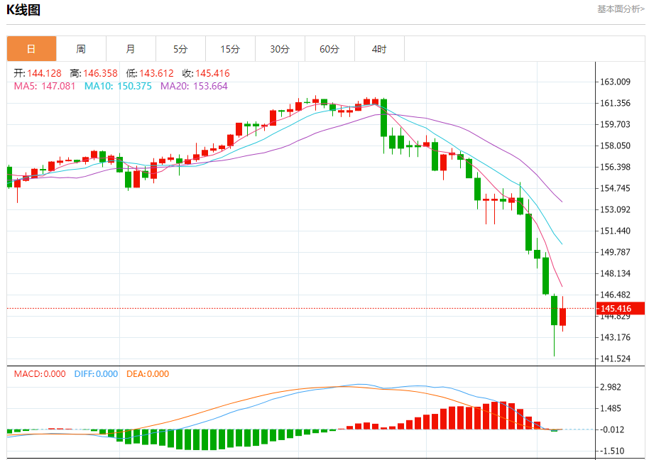 汇价高见146.358,低见143.612。上一交易日,汇价收于144.158。