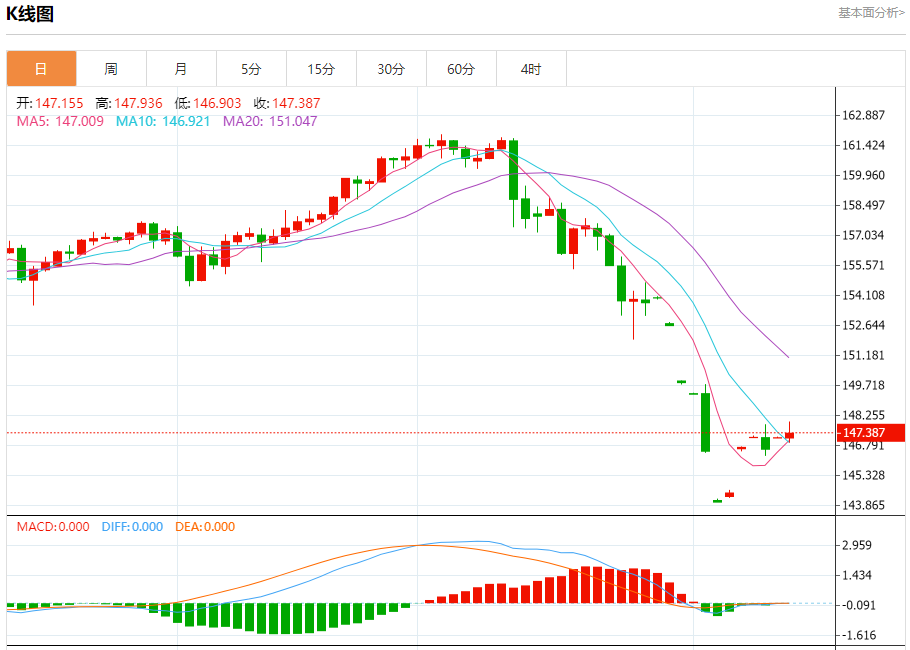 汇价高见147.946,低见146.910。上一交易日,汇价收于147.187。