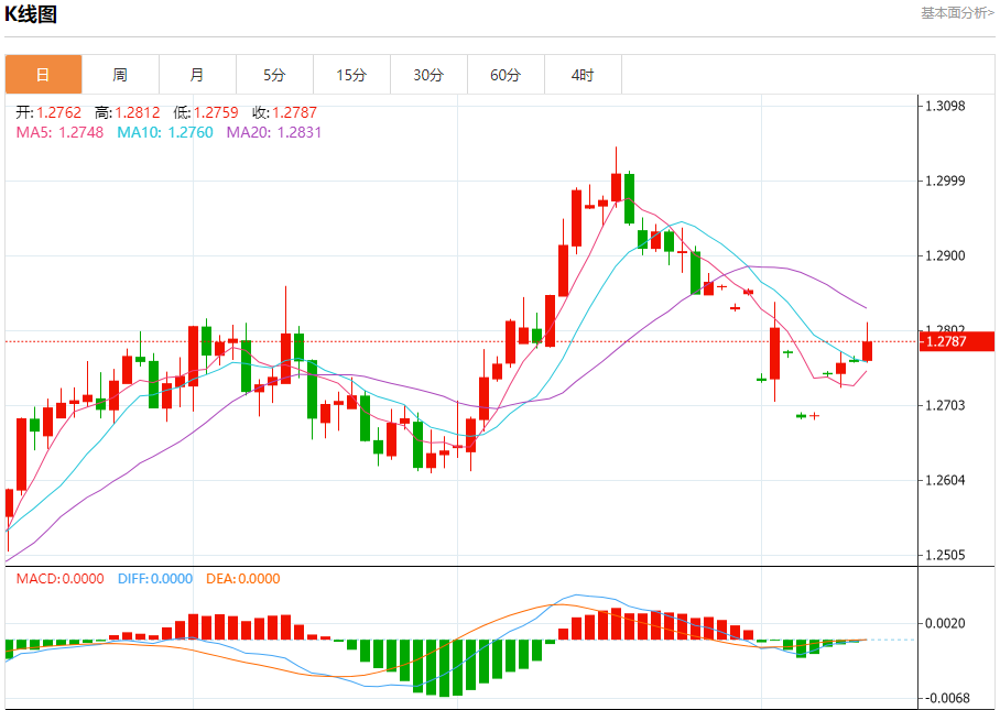 汇价高见1.2813,低见1.2758。上一交易日,汇价收于1.2757。