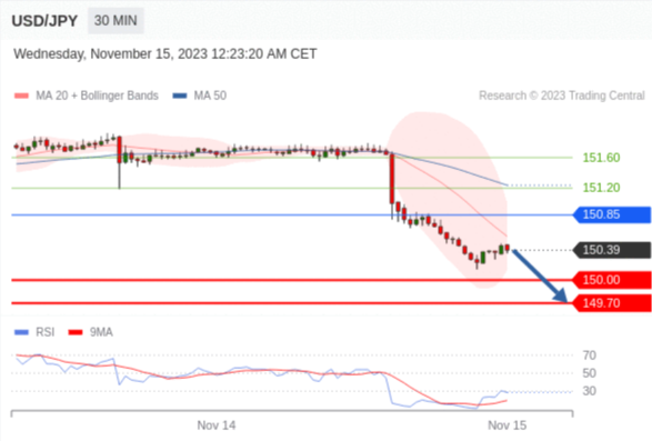 在 150.85 之下,看跌,目标价位为 150.00 ,然后为 149.70 。