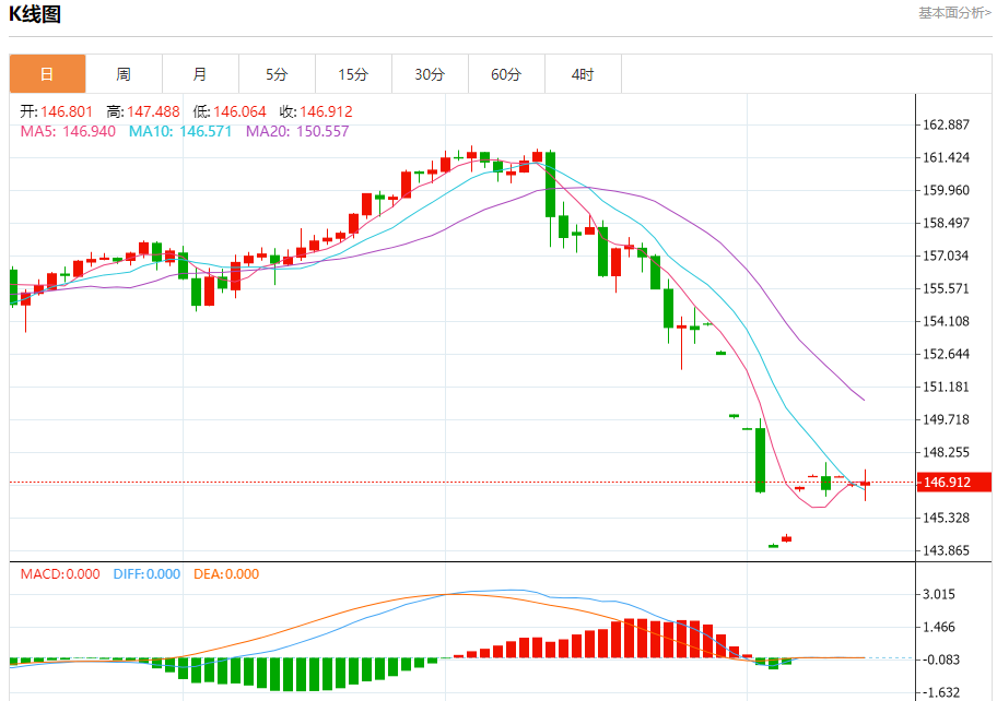 汇价高见147.496,低见146.072。上一交易日,汇价收于146.814。