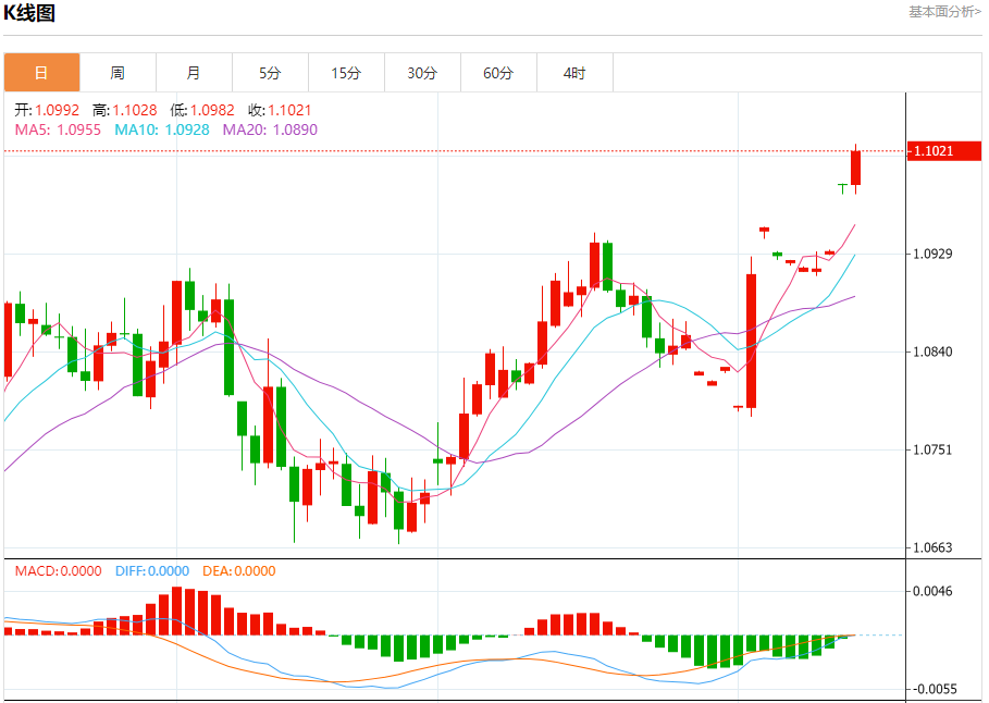 汇价高见1.1028,低见1.0981。上一交易日,汇价收于1.0993。