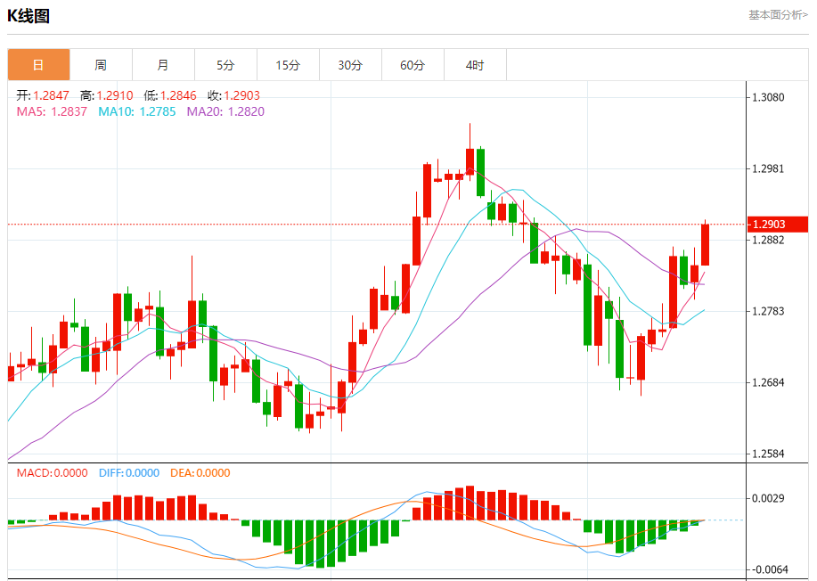 汇价高见1.2910,低见1.2846。上一交易日,汇价收于1.2847。