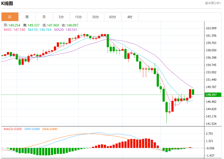 汇价高见149.337,低见147.969。上一交易日,汇价收于149.276。