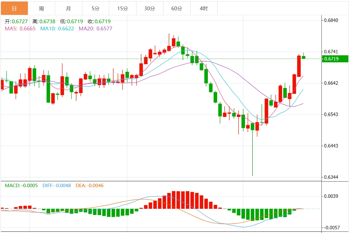 技术分析:澳元徘徊在0.6750附近,目标为七个月高点