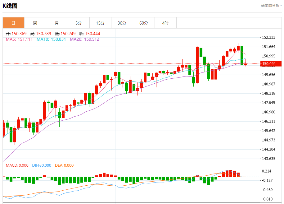 汇价高见150.789,低见150.249。上一交易日,汇价收于150.372。