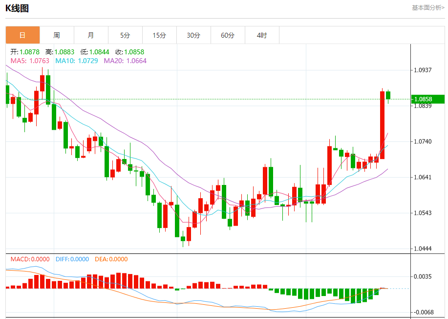 汇价高见1.0883,低见1.0843。上一交易日,汇价收于1.0878。