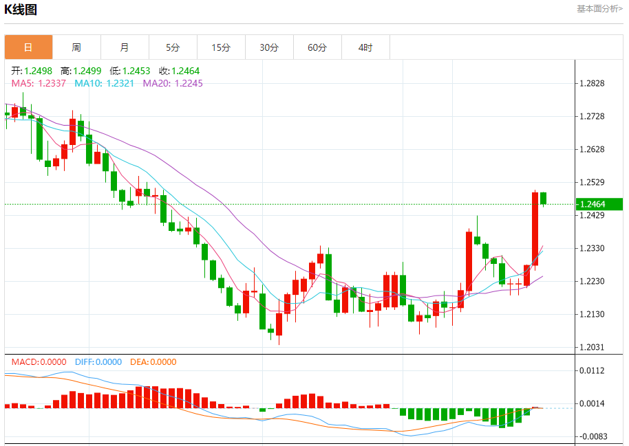 汇价高见1.2499,低见1.2453。上一交易日,汇价收于1.2498。
