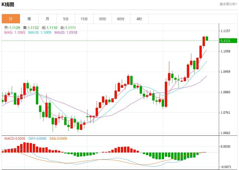 汇价高见1.1132,低见1.1110。上一交易日,汇价收于1.1129。