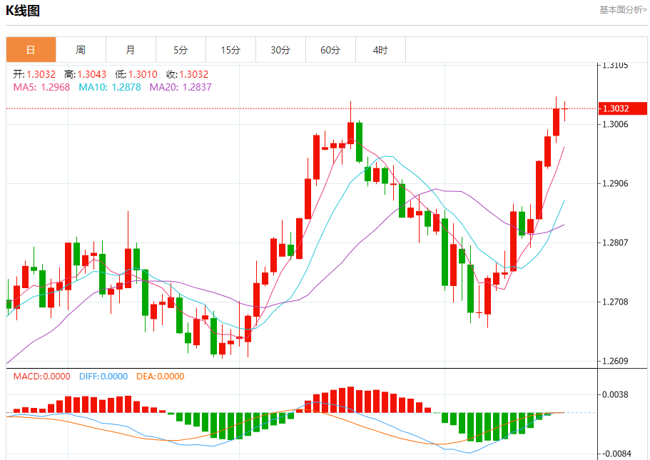汇价高见1.3043,低见1.3010。上一交易日,汇价收于1.3031。