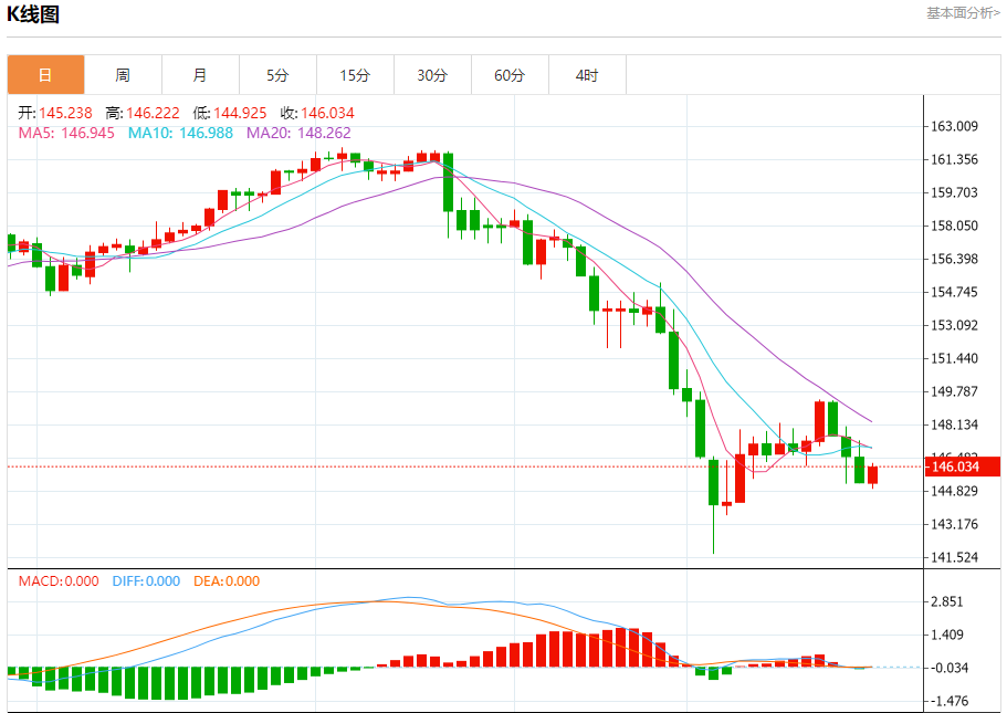 汇价高见146.214,低见144.922。上一交易日,汇价收于145.257。