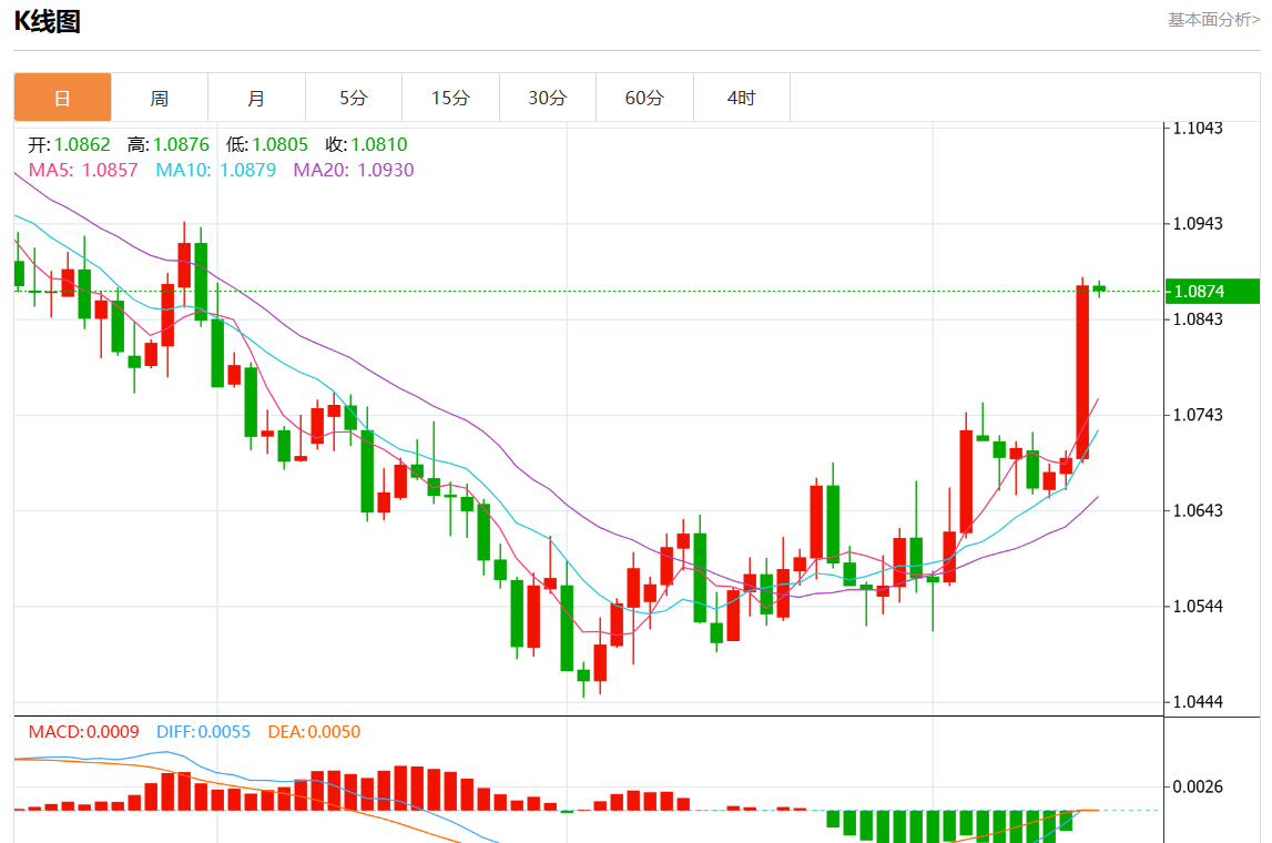 周三欧市盘中,欧元/美元最新报1.0874,日图跌0.04%.