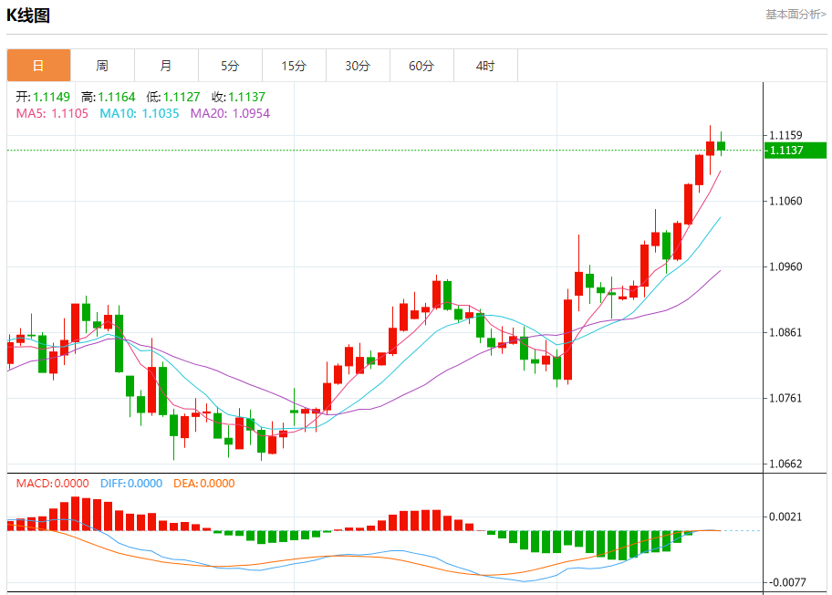 汇价高见1.1164,低见1.1127。上一交易日,汇价收于1.1149。