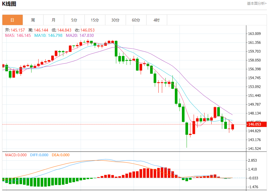 汇价高见146.137,低见144.834。上一交易日,汇价收于145.256。
