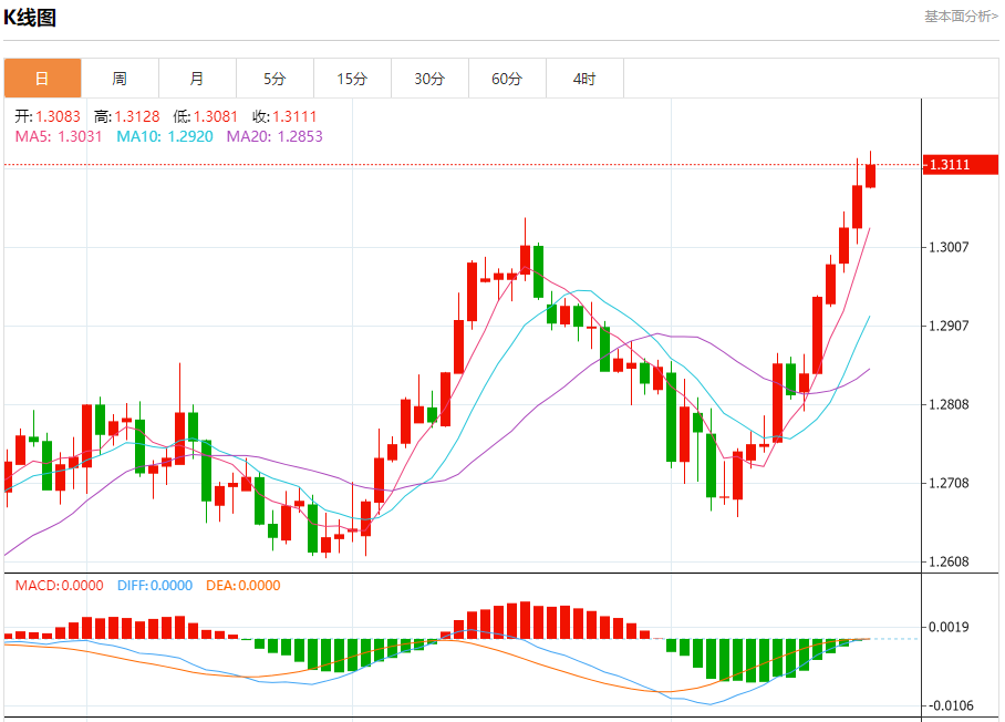 汇价高见1.3128,低见1.3081。上一交易日,汇价收于1.3085。