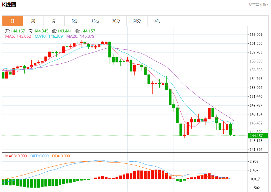 汇价高见144.328,低见143.434。上一交易日,汇价收于144.353。