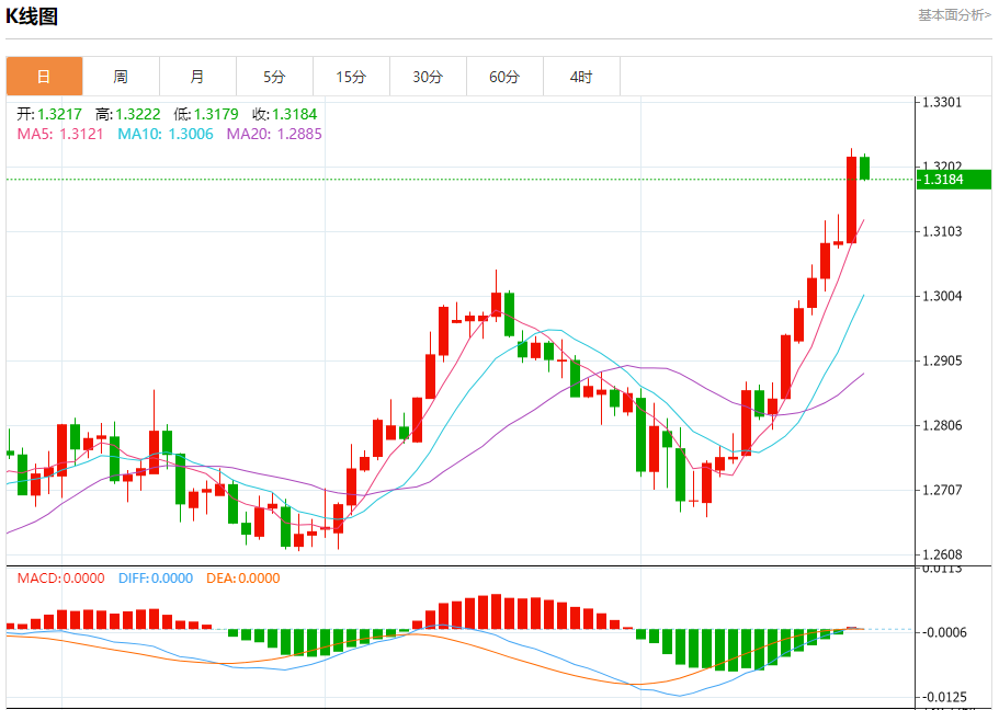 汇价高见1.3222,低见1.3179。上一交易日,汇价收于1.3217。