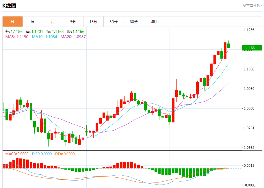 汇价高见1.1201,低见1.1162。上一交易日,汇价收于1.1192。