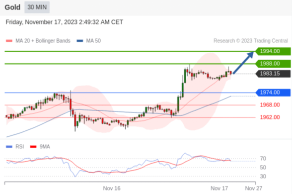 在 1974.00 之上,看涨,目标价位为 1988.00 ,然后为 1994.00 。