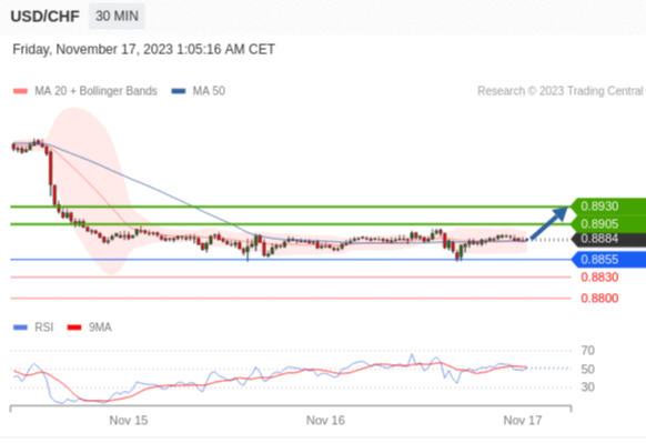在 0.8855 之上,看涨,目标价位为 0.8905 ,然后为 0.8930 。