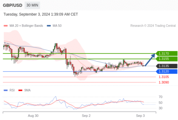 在 1.3120 之上,看涨,目标价位为 1.3155 ,然后为 1.3170 。