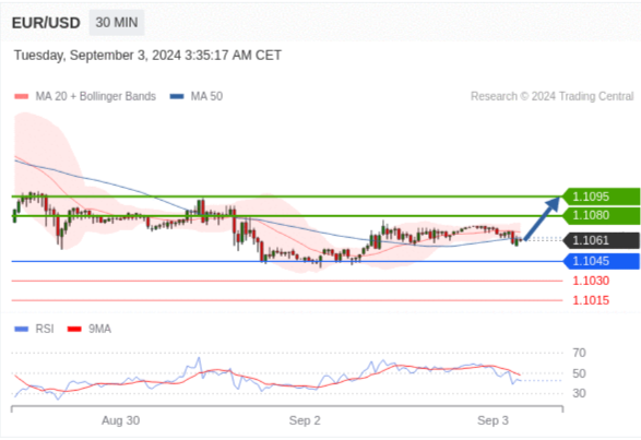 在 1.1045 之上,看涨,目标价位为 1.1080 ,然后为 1.1095 。